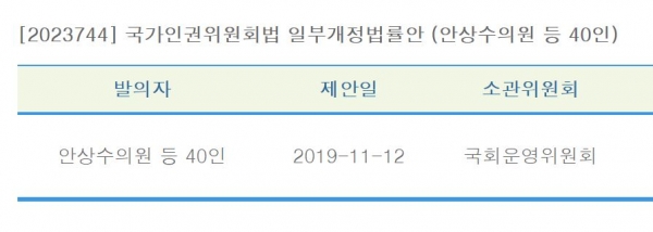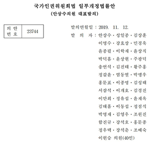 대표발의자 안상수 의원을 비롯해 한국당 민경욱(연수구을)ㆍ정유섭(부평구갑)ㆍ윤상현(미추홀구을)ㆍ이학재(서구갑) 등은 지난 12일 국가인권위법 일부 개정안을 공동 발의했다.