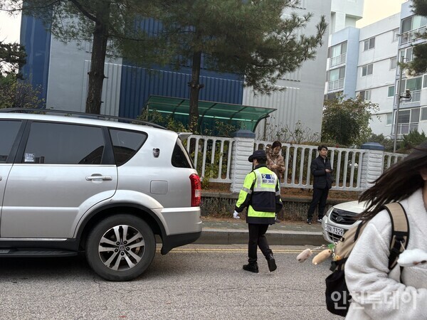인천지역 여학생 616명이 응시하는 25지구 제40시험장인 연수여자고등학교 현장 모습이다. 이날 인천 연수여자고등학교 인근은 이른 아침부터 경찰들이 출동해 교통을 정리했다. 입실 시간인 8시 20분 보다 1시간 일찍 수험생 자녀를 데려다 주기 위한 차량으로 붐볐다.
